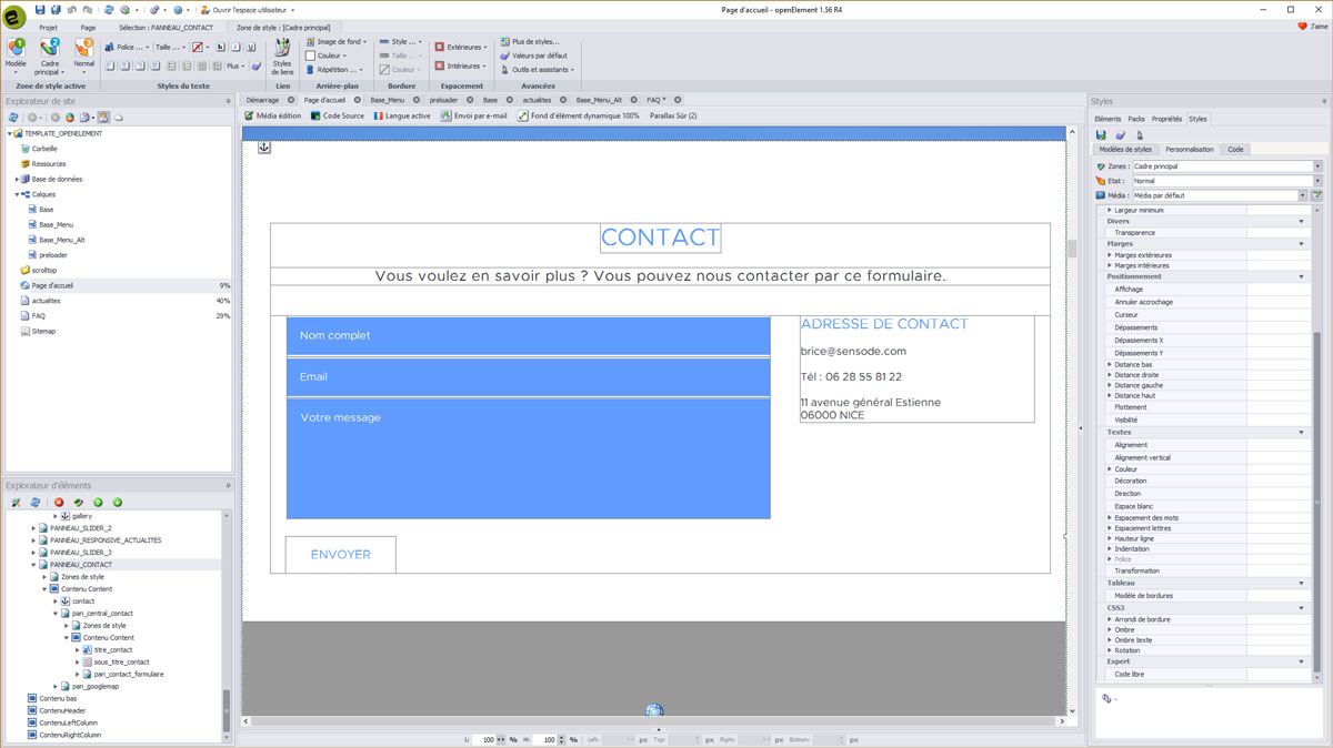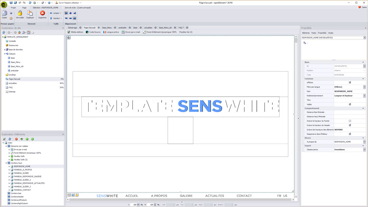 Comme vous pouvez le voir, le template SENSBLACK comporte de tous nouveaux éléments ainsi que du code spécialement développé et intégré au mieux dans Openelement.