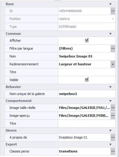 Il s'agit du nom par défaut. Tous les nouveaux éléments Image Swipebox auront le même nom de galerie. C'est à dire que toutes les images seront donc dans une seule et même galerie. Si vous voulez créer des galeries différentes, il vous suffit de changer le nom de celle-ci.