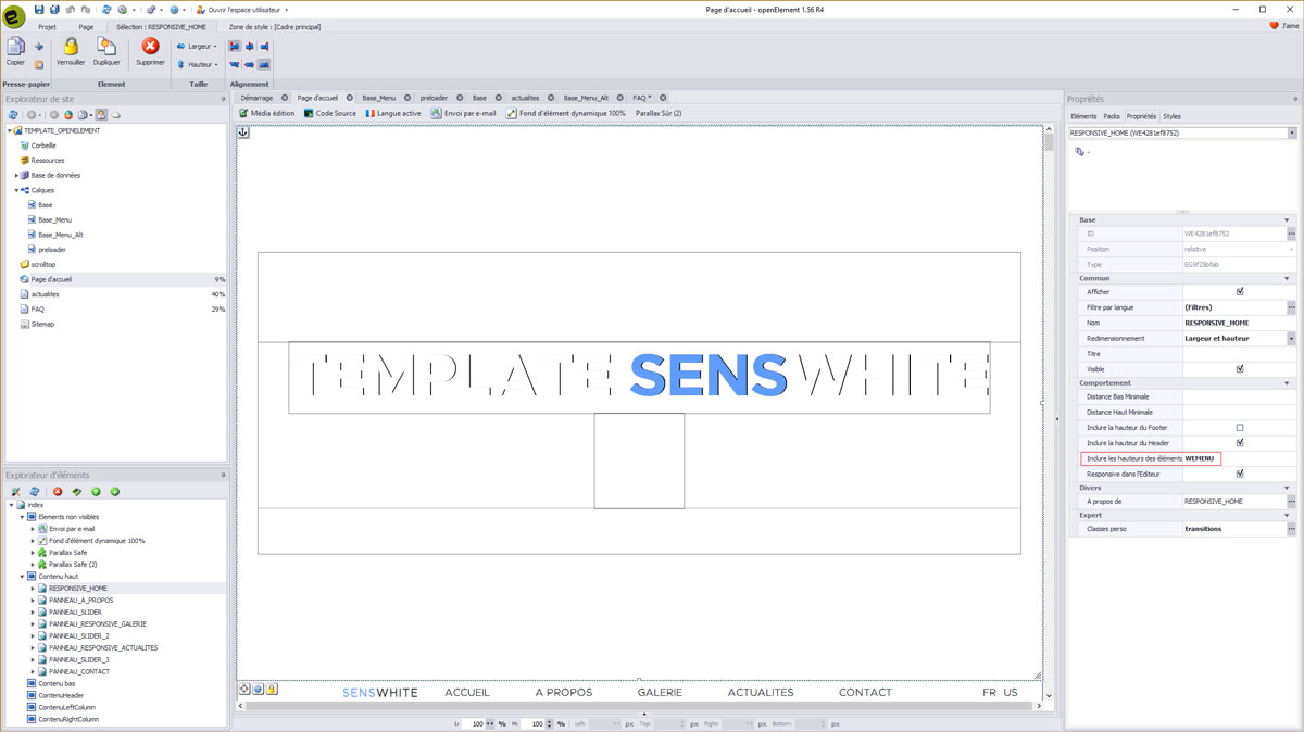 La première partie composant la page d'accueil est l'élément Panneau d'éléments Responsive. Il est associé avec le calque Base_Menu.